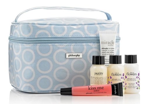NEW! Philosophy 2013 6-piece Travel Skin Care Gift Set: Miracle Worker Miraculous anti-aging Moisturizer + Purity Made Simple 3-in-1 cleanser for face and eyes + field of flowers violet blossom shampoo, shower gel & bubble bath + field of flowers violet blossom Body Lotion + kiss me color pink tinted high-gloss lip shine (FULL size) + a Travel Cosmetic Bag description