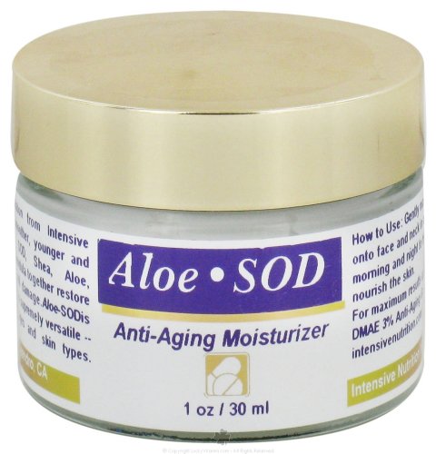 Intensive Nutrition, Inc. - Aloe SOD (Superoxide Dismutase) Anti Aging Moisturizer - 1 oz. (30ml)Intensive Nutrition, Inc. Aloe SOD Superoxide Dismutase Anti Aging Moisturizer is a unique formulation. Intensive Nutrition, Inc. Aloe-SOD Superoxide Dismutase delivers a truly smoother, younger, and more radiant complexion. Intensive Nutrition, Inc. Aloe-SOD contains Shea, Aloe, Superoxide Dismutase, Chamomile,Vitamin E, and Calendula. Together these ingredients help to restore and protect the skin from cell damage. Aloe-SOD Superoxide Dismutase is non-oily, absorbs quickly, is fragrance-free, and is supremely versatile as it is suitable for all skin ages and skin types. Aloe-SOD may be used as a complement to their anti-aging DMAE 3% Crystal Gel. It is available in a 1oz./ 30ml. jar.Dr. Balogh Intensive Nutrition Inc. was founded in 1968 as Scientific Consulting Service, by Dr. Bela Balogh (PhD, Biochemist). Initially, Dr. Balogh consulted oncologists and other health professionals on nutrition, and helped develop nutritional programs for patients. His consulting led to full-scale product development, and soon thereafter, the development of the Intensive Nutrition line and a company name change. Intensive Nutrition Inc. continues the SCS tradition of customer education, and, as its name suggests, focuses on the manufacture of scientifically backed, vigorously researched dietary supplements that are unique in their composition and efficacy. It is particularly important to manufacture products that work with the body's biochemical processes and as a consequence of our commitment to this goal, Intensive Nutrition supplements exhibit the highest bioavailability. Intensive Nutrition focuses on high quality, bioavailability (efficacy), customer education and superior customer service.For example: Intensive Nutrition, Inc.