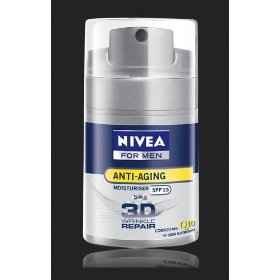 Nivea For men Anti-Aging 5 in 1 Moisturiser SPF 15 3D Wrinkle Repair with Coenzyme Q10 (50ml) Continual exposure to sunlight and stress causes wrinkles get deeper, longer and wider. New non-sticky formula enriched with 5 skin nutrients repairs deep wrinkles from 3 dimensions: in depth, length, and width for a smooth wrinkle-free skin from any ankle. 5 in 1 actions: 1) 3D wrinkle repair in depth, length, and width 2) Minimized pores 3) UVA/UVB protection with SPF 15 4) Lighten and even skin tone 5) Moisten skin immediately while using How to use : Apply morning & evening to face & Neck areas. Ingredients : Aqua, Cyclomethicone, Ethylhexyl Salicylate, Alcohol Denat, Octocrylene, Butyl Methoxydibenzoylmethane, Sodium Phenylbenzimidazole Sulfonate, methyl Methacrylate Crossploymer, Ubizuinone, Sodium Ascorbyl Phosphate, Panax Ginseng Root Extract, Glycerin, Propylene Glycol, Glucose, Sodium Acrylates/C10-30 Alkyl Acrylate Crosspolymer, Acrylamide/Ammonium Acrylate Copolymer, Polysorbate 20, Sorbitan Isostearate, Polyisobutene, Polymethylsilsesquioxane, Dimethiconol, C12-15 Alkyl Benzoate, Trideceth-9, PEG-40 Hydrogenated Castor Oil, Trisodium EDTA, Phenoxyethanol, Methylparaben, Parfum