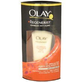 Renews and helps protect skin for a more beautiful you. Perfect for daytime use; Olay Regenerist UV Defense Regenerating Lotion combines the exclusive Olay amino-peptide complex with vitamin C; Olay moisture and UVA/UVB (SPF 15) sunscreen to speed surface cell turnover and enhance skin's condition one cell at a time. This light; non-greasy formula with a light; fresh scent smoothes evenly onto the skin and includes light-bending powders to soften the look of fine lines and wrinkles.