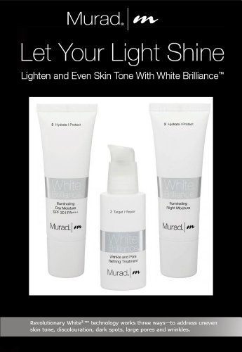 Murad's White Brilliance Regimen- a unique brightening system powered by Murad's revolutionary 3X White technology- that works in three ways to address uneven skin tone, discoloration, dark spots, large pores and wrinkles. White Brilliance improves skin luminosity, evens complexion, and lightens spots while boosting skin renewal and minimizing the appearance of large pores for a luminous, even complexion.